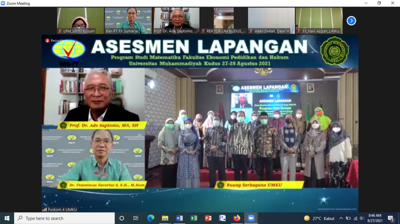Senin-Selasa (27-28 Agustus 2021) Tim Assesor BAN PT yaitu Prof. Ade Saptomo, MA.,SH dari Universitas Pancasila dan Dr. Fransiscus Xaverius, S.H.,M.Hum dari Universitas Lampung telah melaksanakan Assesmen Lapangan secara Daring di Universitas Muhammadiyah Kudus pada Program Srata 1 (S1) Hukum. Kegiatan tersebut disambut hangat oleh Rektor UMKU yakni Bapak Rusnoto, SKM.,M.Kes (Epid) Beserta jajarannya. Program …